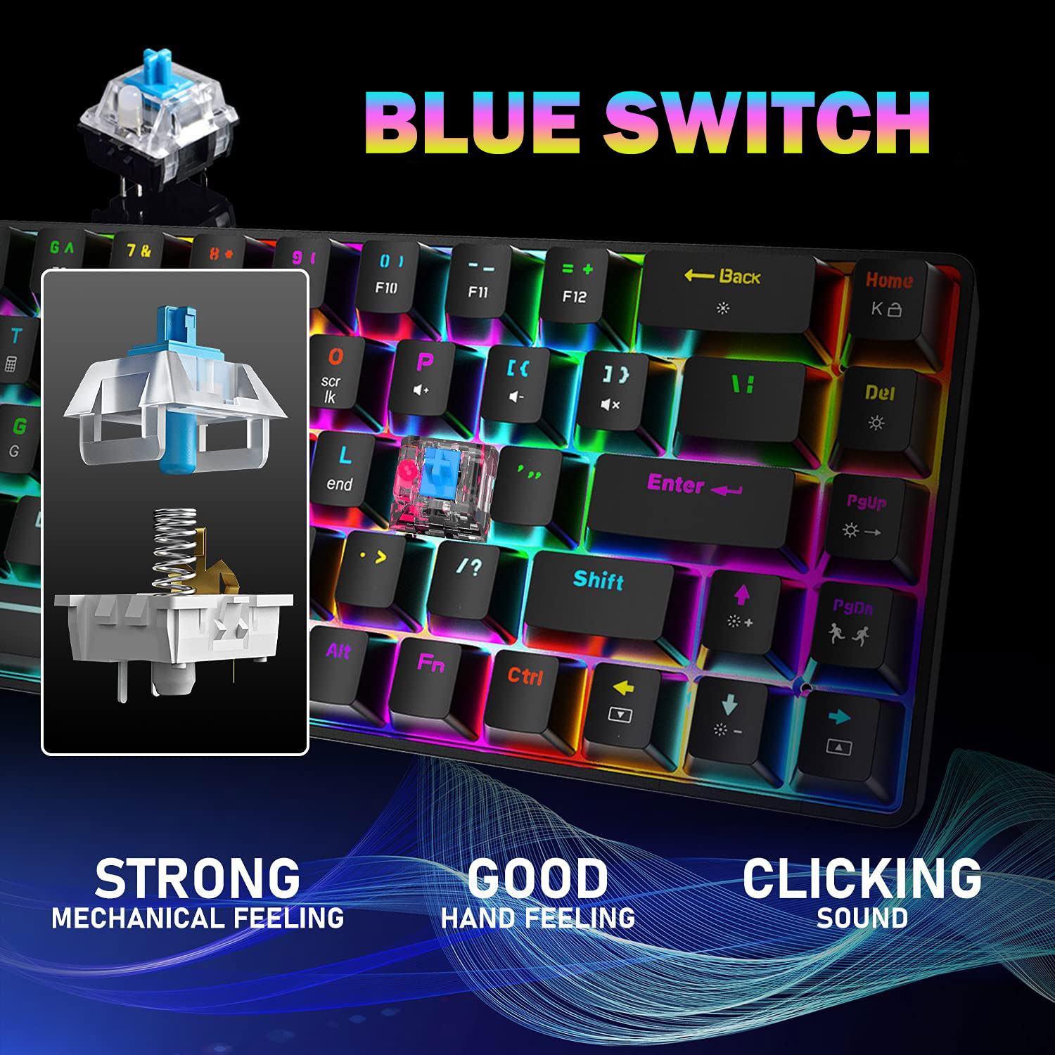 - The classical Blue Switch design to provide a highest tactical feedback and the clearer “Click” sound than normal keys. It will give you deliver accurate, comfortable responsive no matter you’re typing or gaming, perfect for professional gamers and typists.