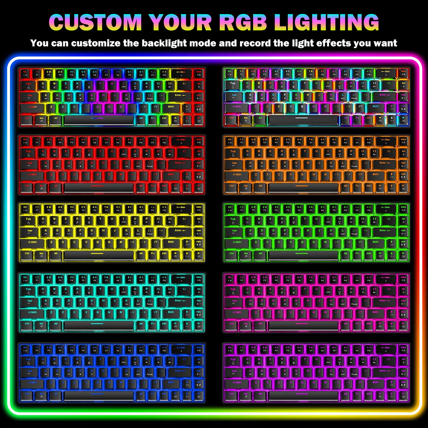 - The keyboard has as many as 18 kinds of backlight modes, giving you a comfortable visual enjoyment at night. You can select your favorite backlit mode through the FN+Tab key, and switch the color you like with the FN+PgUp key.