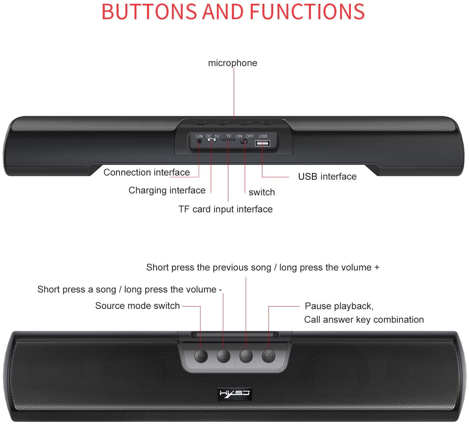 - Bluetooth 5.0 computer speakers supports Bluetooth connection playback, but also support TF card does not exceed 32G, USB, AUX-IN four playback modes. “M” button source modes switch.