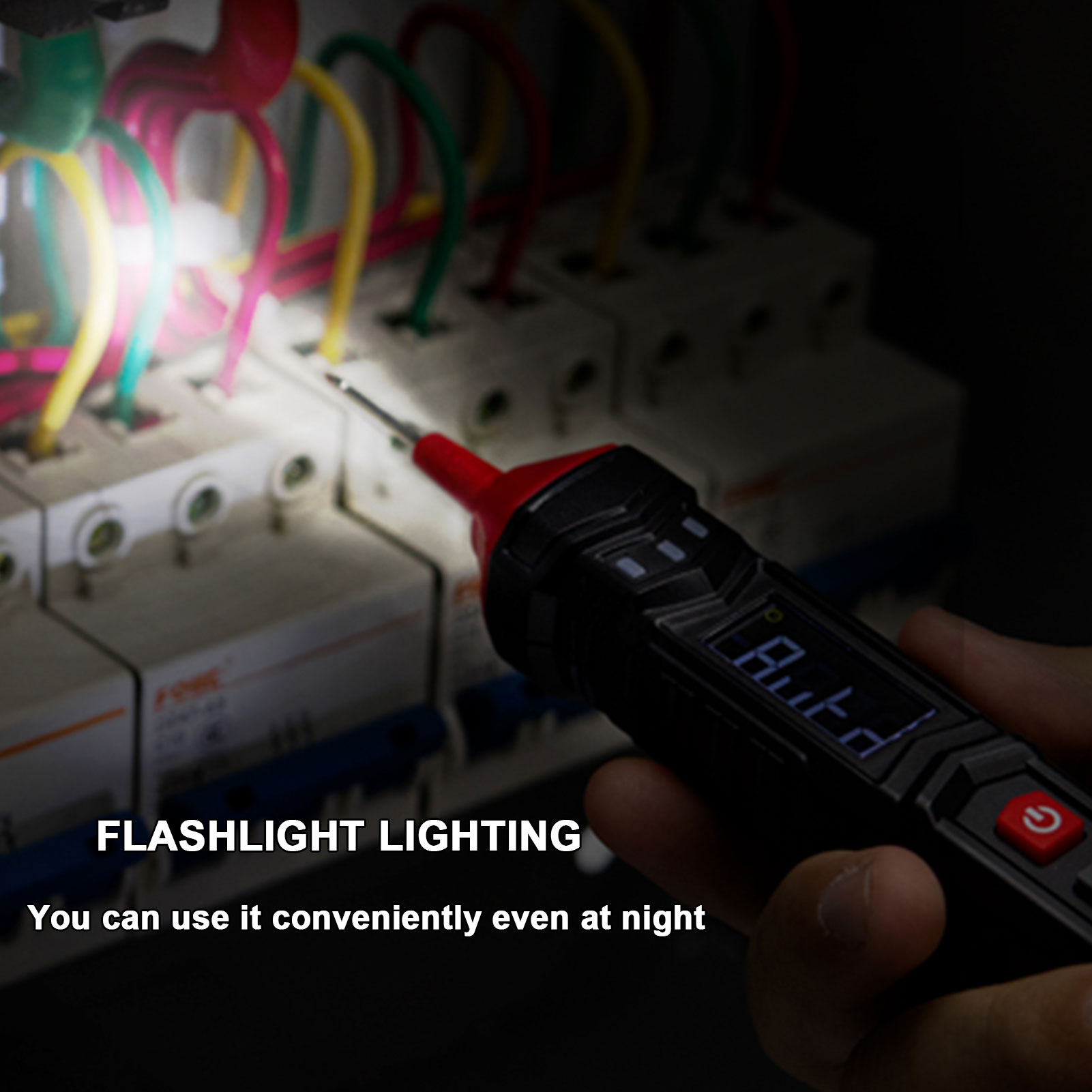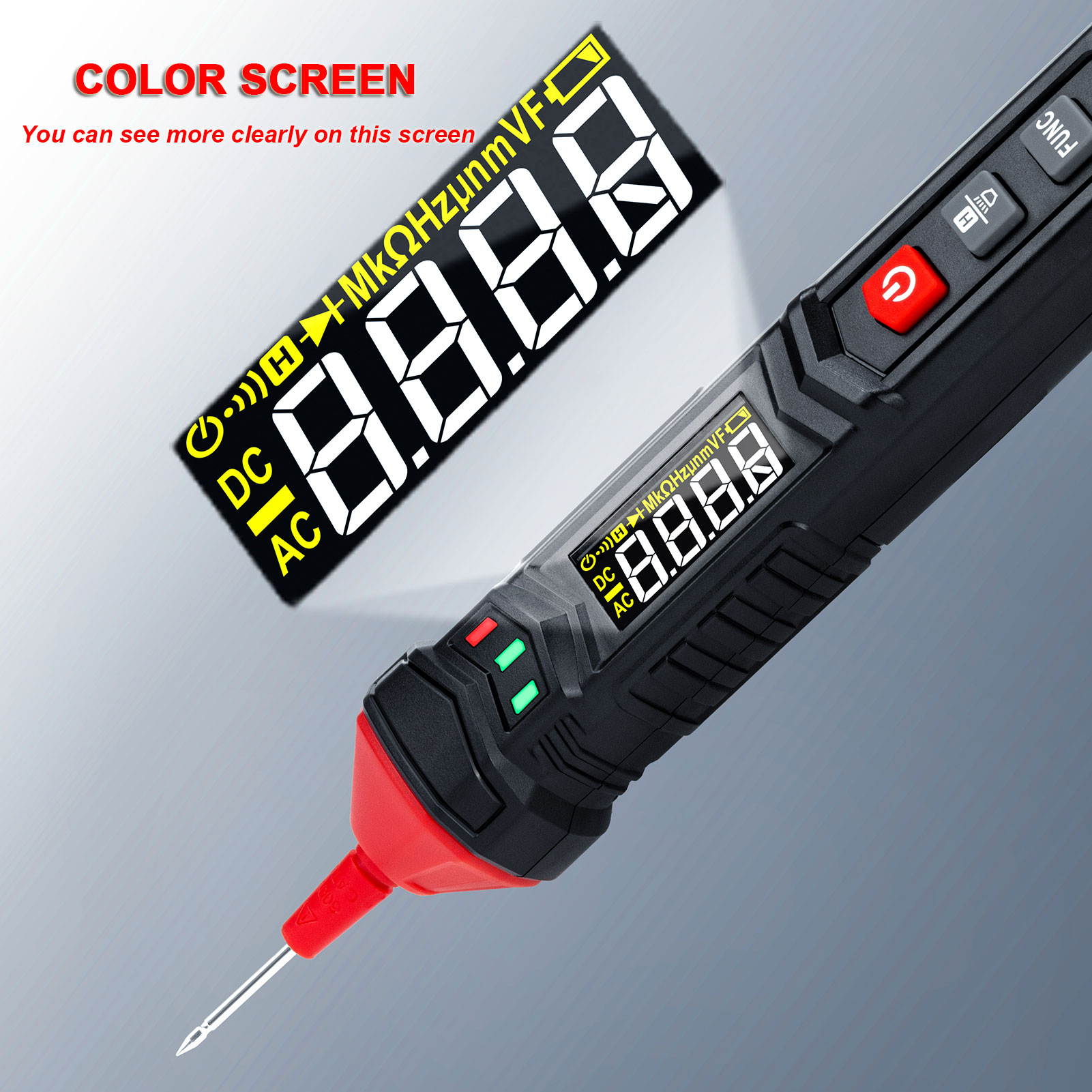 【Easy to Use】Switch measurement mode with button “Func” and hold data with button “H” . Backlight LCD screen ensures reading to be clearly seen in either dark or bright areas. The flashlight below the red probe helps you to work without concerns under dim light.